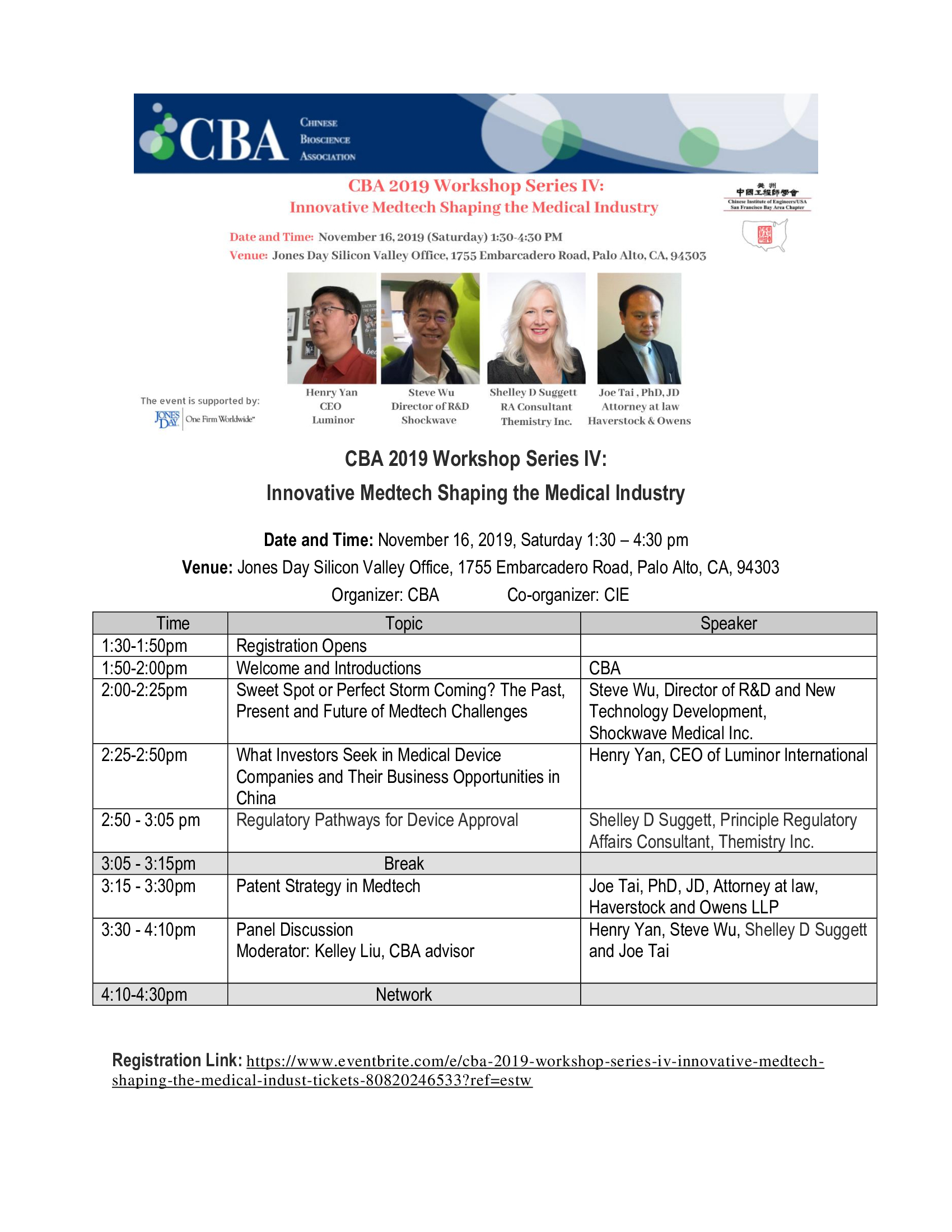 16 November 2019: CBA Workshop Series IV Share EmailXFacebookPinterestLinkedinVkontakte CBA, together with our alliance CIE, is co-hosting the Workshop Series IV: Innovative Medtech Shaping the Medical Industry on 16 November 2019 at 1:30pm. Please find the agenda below and click here to register. We hope to see you there! November 10, 2019 Upcoming Events